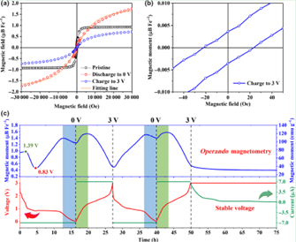 FeO是典型的反铁磁材料,然而由于表面对称性改变等原因,其表面磁性备受关注。利用水热法制备γ-Fe2O3材料,作为锂离子电池负极。根据转换反应机制,当放电至0V,还原生成Fe纳米颗粒,进而充电至3V,氧化生成FeO纳米颗粒。Fe纳米颗粒的尺寸约为2.24nm,表面原子比为60%,所以FeO颗粒的磁性主要来源于表面磁性。经原位实时磁性测量,FeO颗粒在室温具有明显铁磁性,表明FeO纳米颗粒的表面为铁磁性。