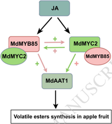 图1 JA通过MdMYC2-MdMYB85-MdATT1基因模块调节苹果果实中酯类香气的合成