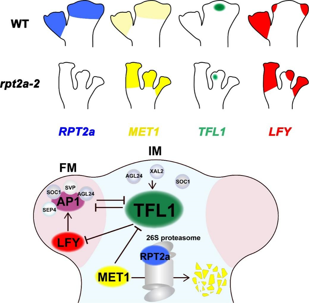 该研究发现拟南芥26S蛋白酶体亚基RPT2a的突变导致拟南芥花序分生组织维持能力减弱,出现“之”字形有限花序的表型。进一步研究发现,在rpt2a-2突变体花序中,花序分生组织特征基因TFL1的表达水平显著降低可能是导致花序发育异常的原因。通过蛋白质组学分析发现,rpt2a-2突变体花序中DNA甲基转移酶MET1的水平显著上调;同时生化实验证实,RPT2a能够直接和MET1蛋白互作并降解MET1,而MET1能够通过调控TFL1基因启动子的DNA甲基化水平影响TFL1基因的表达。综上所述,RPT2a通过26S蛋白酶体途径调控DNA甲基转移酶MET1的蛋白水平,进而调控花序分生组织特征基因TFL1的DNA甲基化水平,影响其在花序分生组织中的表达水平,最终调节拟南芥花序分生组织活性和花序构型。