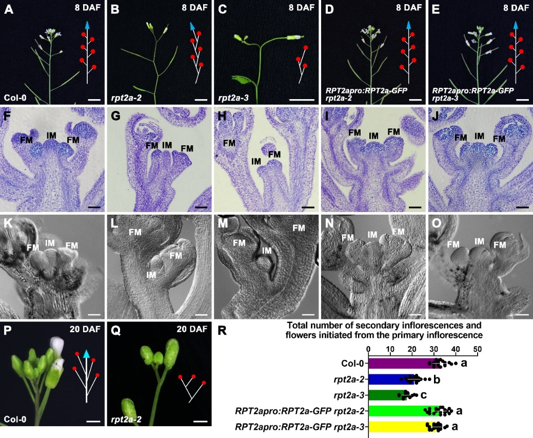 图1. RPT2a突变导致拟南芥出现有限的“之”字形花序