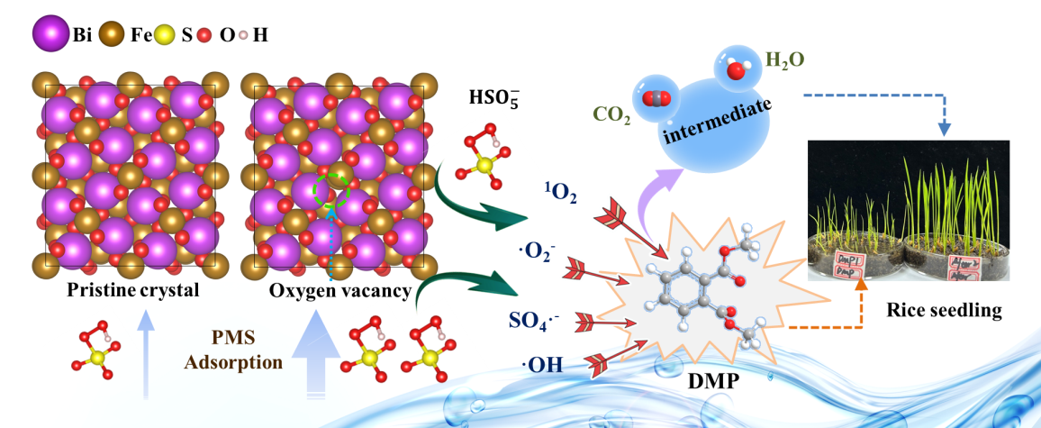 在此背景下,王军教授研究团队聚焦于Bi2Fe4O9材料,利用抗坏血酸刻蚀与紫外光照相结合的方法,在Bi2Fe4O9纳米片中成功引入氧空位,制备了一系列含氧空位的催化剂BFO-LA。研究表明,氧空位促进了电子转移和活性物种的生成,显著提升了邻苯二甲酸二甲酯(DMP)的降解效率。此外,利用T.E.S.T模拟软件和水稻幼苗土培试验验证了DMP降解后毒性的降低,证明了该方法在环境治理中的潜在应用价值。