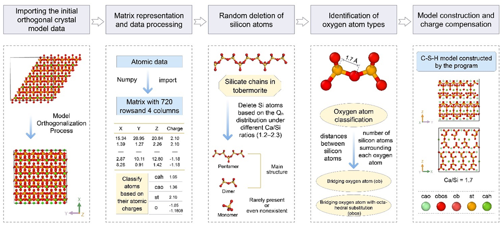 水化硅酸钙(C-S-H)凝胶是水泥水化过程的主要产物,约占全部水化产物的 50%–60%,是混凝土中起到粘结作用的主要凝胶相。在纳米尺度上应用分子动力学(MD)模拟研究C-S-H力学性能、界面作用机制等问题已成为近年来的研究热点之一。由于水泥水化产生的C-S-H凝胶不具有特定分子结构,很多研究者在构建C-S-H分子模型时以托贝莫来石(Tobermorite)晶体结构作为初始框架,在硅酸盐链中引入随机缺陷使其符合实验表征的钙硅比和硅酸盐聚合度(Qn)。这一模型构建过程较为复杂,且具有较高随机性,不同研究者得到的初始构型可能存在一定差异。本论文提出了一种完全随机的建模程序,可以使模型满足钙硅比、Qn、电荷平衡等条件,并探讨了多种随机构型在拉伸、剪切、输运等基本问题的研究中可能存在的影响。相关程序已在GitHub平台开源共享,为建立标准化的C-S-H模型提供了重要见解。