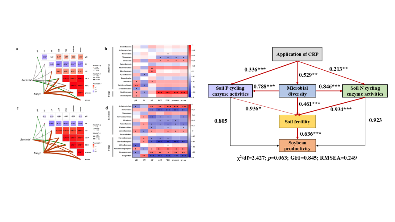 本研究通过两年田间试验(2023-2024年),结合16S rRNA和ITS测序技术和结构方程模型(SEM)解析了施用控释磷肥对土壤微生物、土壤氮-磷循环酶活性、土壤肥力和大豆生产力的影响及其相互作用关系。结果表明,施用控释磷肥增加了土壤细菌和真菌群落多样性及有益微生物(Bradyrhizobium,Lysobacter,Sphingomonas和Flavisolibacter)的相对丰度,提高了土壤氮、磷循环酶的活性。在土壤微生物和养分循环酶的作用下,土壤肥力和大豆生产力得到提高。其中,大豆产量提高1.7%~12.9%,大豆磷肥利用效率提高1.1~22.5个百分点。研究结果为磷肥高效利用和大豆可持续生产提供了理论依据和积极贡献。
