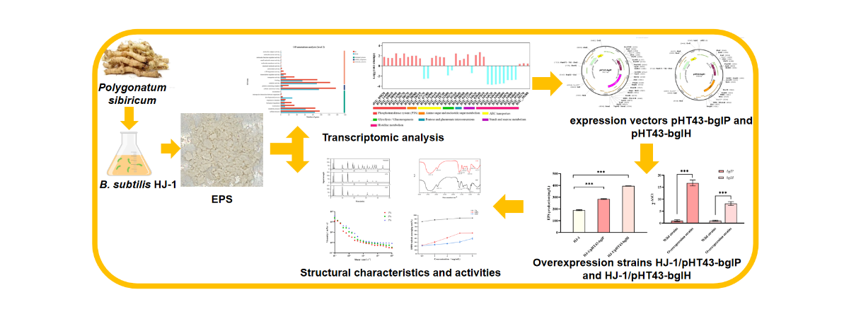 基于此,团队研究聚焦于一株从泰山黄精中分离的内生菌——枯草芽孢杆菌(Bacillus subtilis)HJ-1,对其产生的胞外多糖的结构及特性进行分析,结果表明HJ-1胞外多糖与黄精多糖相似,且其体外抗氧化能力优于黄精多糖。通过转录组学研究深入解析其合成机制,鉴定出一系列与胞外多糖合成相关的基因,其主要涉及单糖运输、核苷酸糖合成、多糖聚合、运输和调控等关键代谢途径,明确了其体内多糖合成的分子机制;并进一步利用代谢工程手段对参与核苷酸糖的合成过程中两个关键基因(bglP、bglH)进行同源过表达,其胞外多糖产量分别比野生型菌株提高了150%和210%,这一研究成果综合利用了代谢工程、系统生物学、合成生物学等技术,为工厂化生产具有黄精多糖活性的内生菌代谢产物提供了技术支撑,具有重要的经济和社会价值。