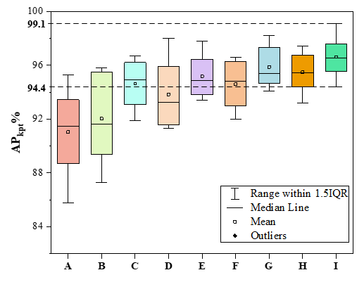 图1 消融试验结果箱线图。模型A-I分别对应不同的改进方法。